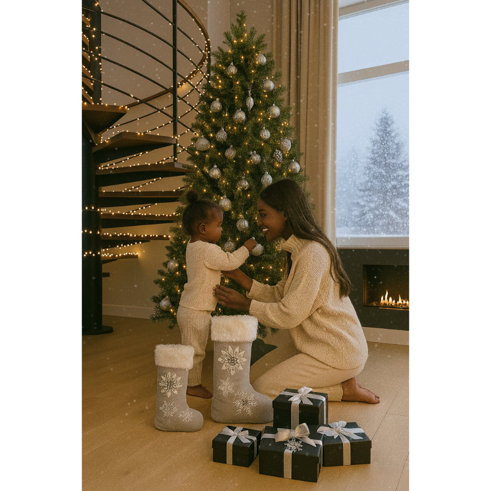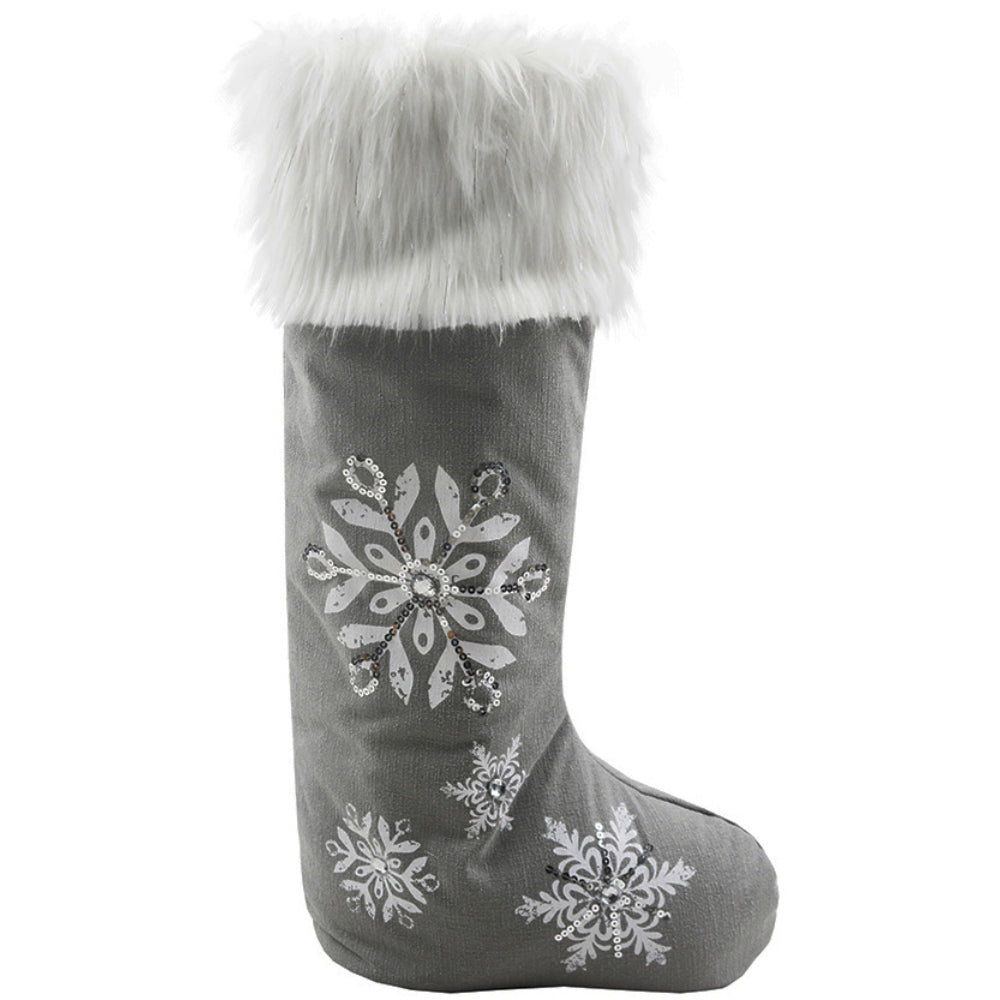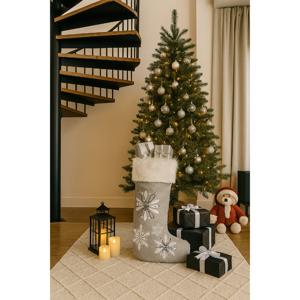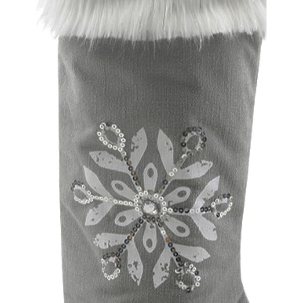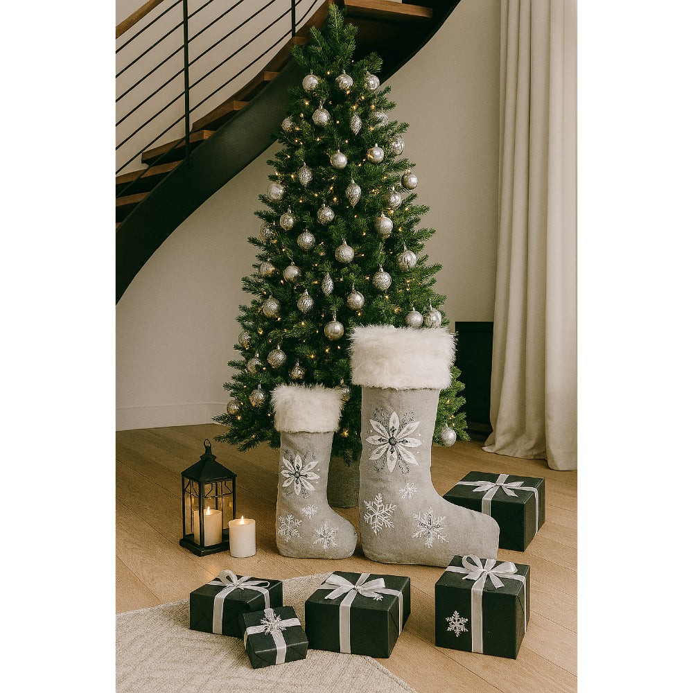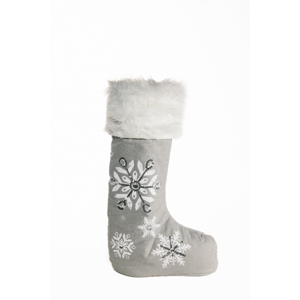 Our “Snowstorm” Standing Stocking is Modern, Stylish and Contemporary. The Cuff is a White Long hair Faux Fur with Silver Streaks. The Grey Polylinen body features several sized falling White Snowflakes with a clear (plastic) Crystal Faceted Stone Center for that extra Sparkle! This item does NOT have LED Lights